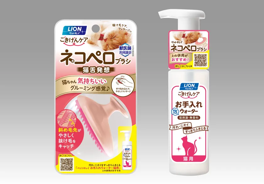 そこでこの度、猫の舌をモデルにしたブラシ構造で猫が喜ぶブラッシングができる『ペットキレイ ネコペロブラシ 猫用』と、毎日のブラッシングに加え、定期的なブラシとのセット使用で猫のボディの汚れやニオイをすっきり落とせる『ペットキレイ お手入れウォーター 猫用』を新発売いたします。