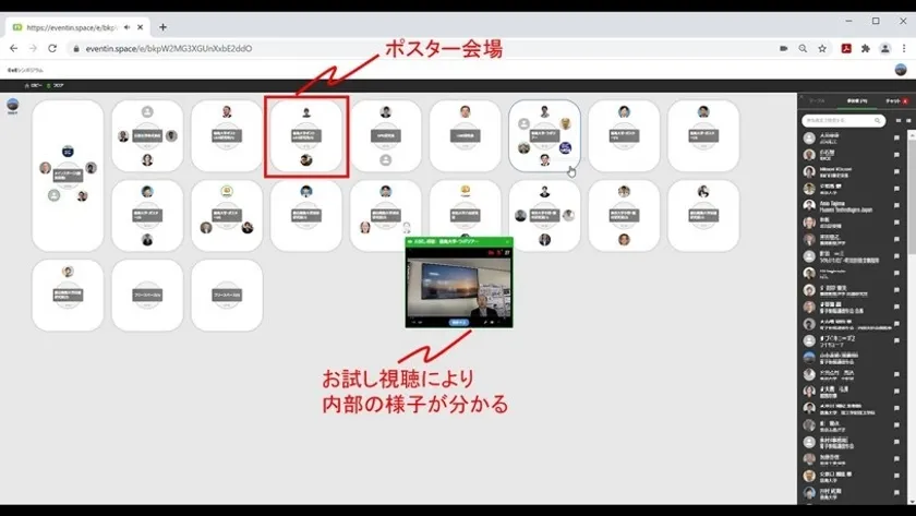 ブイキューブが提供するオンラインイベントプラットフォーム「EventIn」は、従来のリアルイベントのように、複数の個別セミナーの同時開催や参加者同士のビデオ通話やチャットによる自由な双方向コミュニケーションが取れるライブ配信型のオンラインイベントプラットフォームとなっています。学会活動においてはリアル開催時と同じように、複数のポスターテーブルで講演、議論が同時並列に行なわれ、参加者は任意のポスターテーブルより参加し、聴講や議論を行なうことが可能です。さらに参加者はポスターテーブルをテーブルの外からクリックすることにより、お試し視聴が可能であり、面白そうなトピックスを探すことが容易です。内部の講演者等からはお試し視聴されていることは分からないため、遠慮することなく、次々とポスターテーブルを巡って頂けます。一方、商談やノウハウに関わる議論のために、参加者を限定するテーブル内部からのロックも可能です。当日はブイキューブの運用サポートにより、安心して、シンポジウムを進行できました。