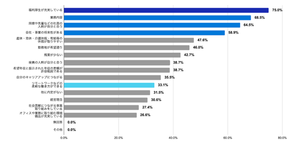 前述の質問で「その他条件によっては辞退しない」と回答した学生(124名)に対して、辞退しない条件に関する質問をしました。第一位が「福利厚生が充実している(75%)」第二位は「業務内容(68.5%)」でした。会社の制度や仕事に関する条件だけでなく、社員や同僚など一緒に働く社員の人柄や、会社の将来性に関する回答も半数を超えています。
