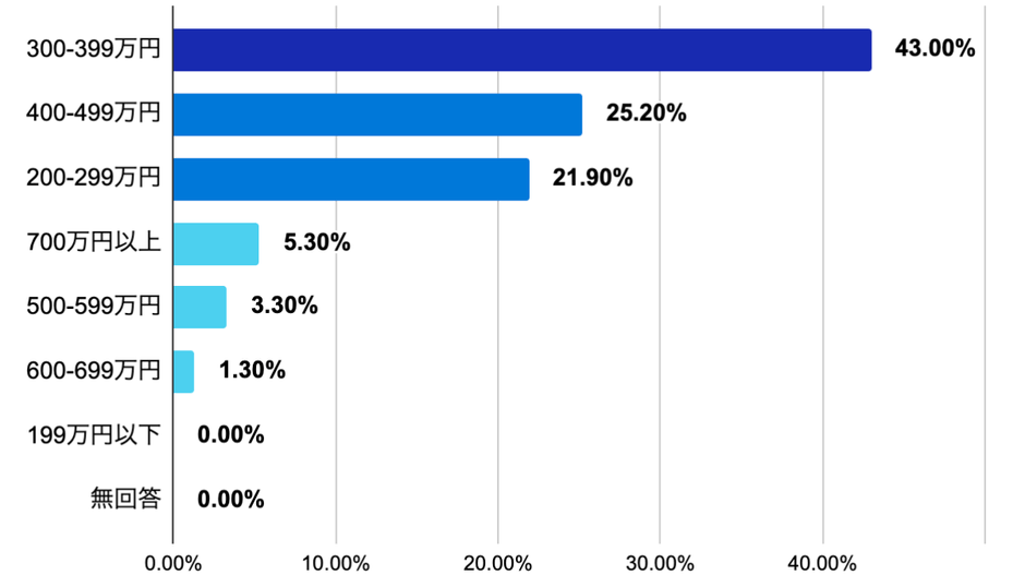 希望年収に関する設問は、300万円〜399万円が最多の43%でした。続いて、400万円〜499万円(25%)。