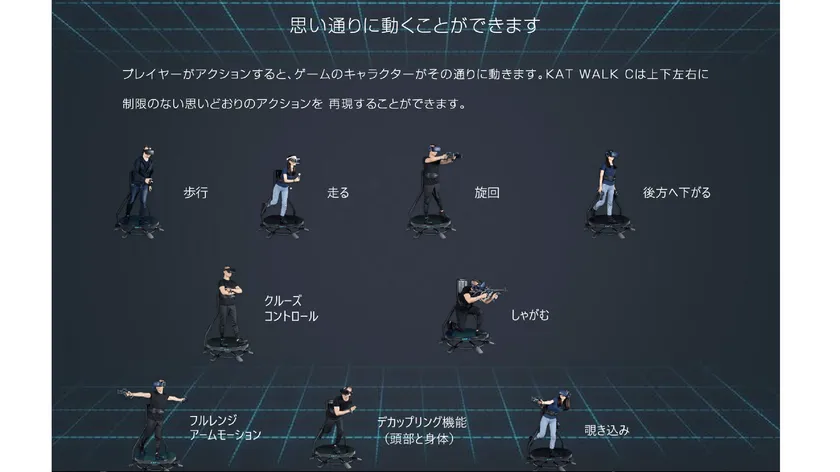 歩行はもちろん、走る、横移動、広報移動、KATWALKCは頭と体の角度を別々に計測してくれるので、まっすぐ走りながら走りながらよそ見も出来ます。