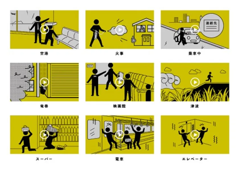 防災アニメーションは、「空港」「スーパー」「電車」などのシーン別で災害が発生した場合にどう対応したら良いかや、「竜巻」「津波」などの災害種別で気をつけるべき点や対応方法について15秒程度で端的にまとめてあります。1つの防災アニメーションだけでの利用も可能ですし、複数点まとめての利用も可能です。