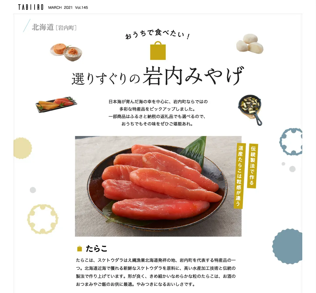 また、旅の思い出に、そして旅に行けないときはおうちで楽しめる、岩内町選りすぐりの特産みやげもご紹介しています。