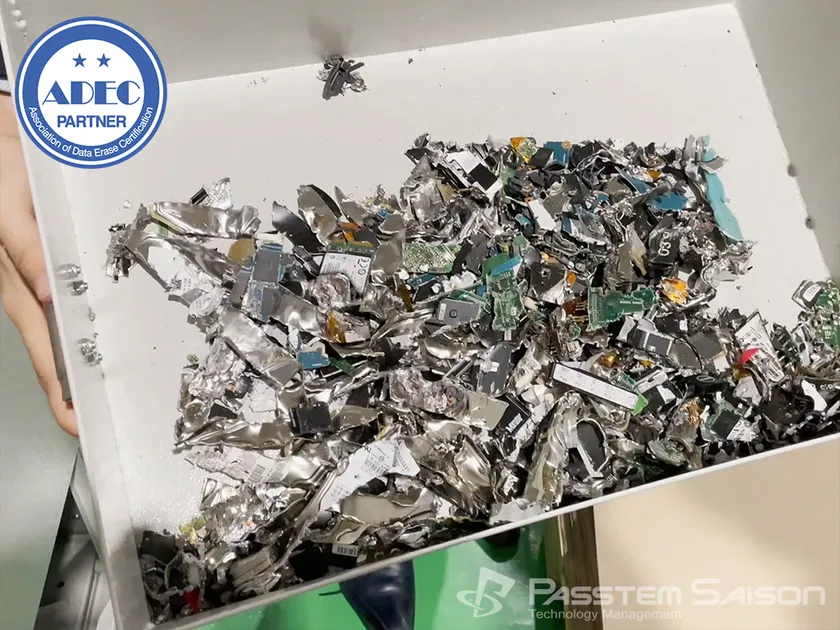 またADECより認証を受けている電子的消去に導入している専用消去ツール「flasherase」(株式会社ウルトラエックス製)が記憶媒体のデータ消去に使用出来ない場合は、物理的な破砕処理を施し、破砕前と破砕後の写真撮影を行い証明書として発行、提供しています。