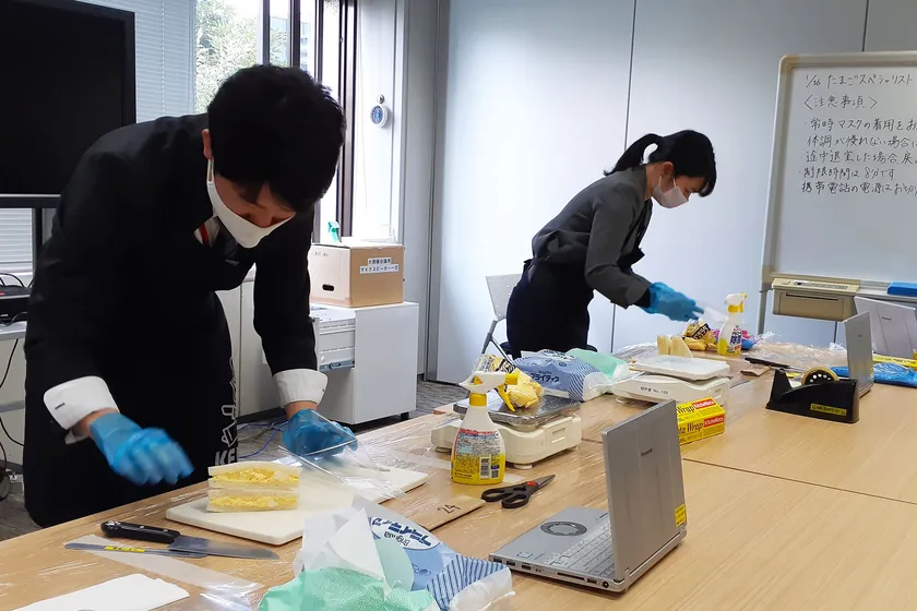 初回から実施している「たまごサンド作り」は、決められた時間内に三角のたまごサンドを作り、フィルム包装まで行います。簡単そうに見えて実は手間がかかるたまごサンド。プロであるお客様へ提案できるレベルかどうか、日頃当社でメニュー開発を担当する社員が厳しく採点しています。