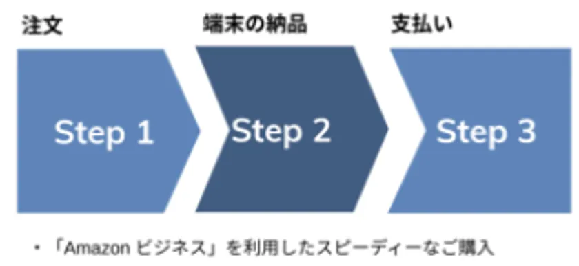 購入者様は「Amazon ビジネス」で端末の購入・支払いを行います。「Amazon ビジネス」を通じてスピーディーな購入が可能で、端末の送付場所は自由に設定することができるため、リモートワーク環境下でも快適にご利用できます。