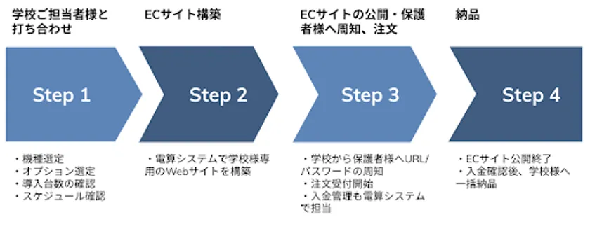 まず、学校のご担当者様と電算システムとで、導入したい機器やその台数、設定するオプション、スケジュールなどの確認を行っていただきます。続いて、電算システムが学校様専用のECサイトを構築します。専用サイトのため、端末の買い間違えなどのリスクを低減できます。