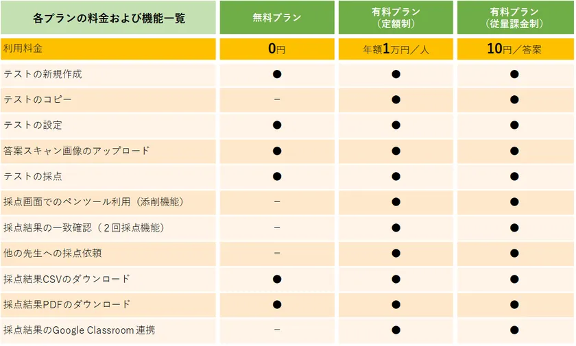 また、「有料プラン(定額制)」は、教師1名につき年額1万円(税抜)で、答案の枚数制限なしにご利用いただけるプランです。答案1枚10円(税抜)の「有料プラン(従量課金制)」では予算化が難しい学校でも、導入しやすいプランを設けました。