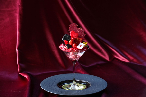 今回の大人のご褒美パフェは“ダークプリンセス~不思議の国のアリス~”をテーマに赤と黒の世界を甘酸っぱい“ラズベリー”と苦みが程よい“ブラックチョコレート”で表現。