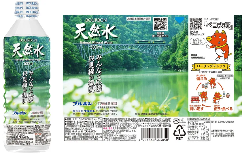 株式会社ブルボン(本社:新潟県柏崎市、代表取締役社長:吉田 康)は、2011年7月の新潟・福島豪雨で被災し、2022年度中の全線再開を目指しているJR只見線を応援するミネラルウォーター「福島県只見線応援天然水500ml」を2021年3月11日(木)に販売開始いたします。