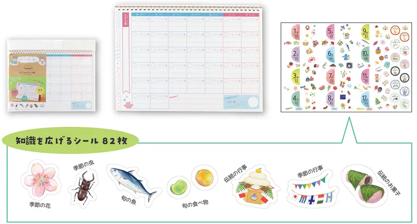 こどもが自ら予定を管理し、やるべき事や楽しみを見える化する事で自立と成長をサポートする。季節の植物、旬の食べ物、日本の伝統行事など82枚のこどもの知識を広げるシール付きで、日付が入っていないのでいつからでも始められるなど、気軽に楽しく続けられる工夫が施されている。