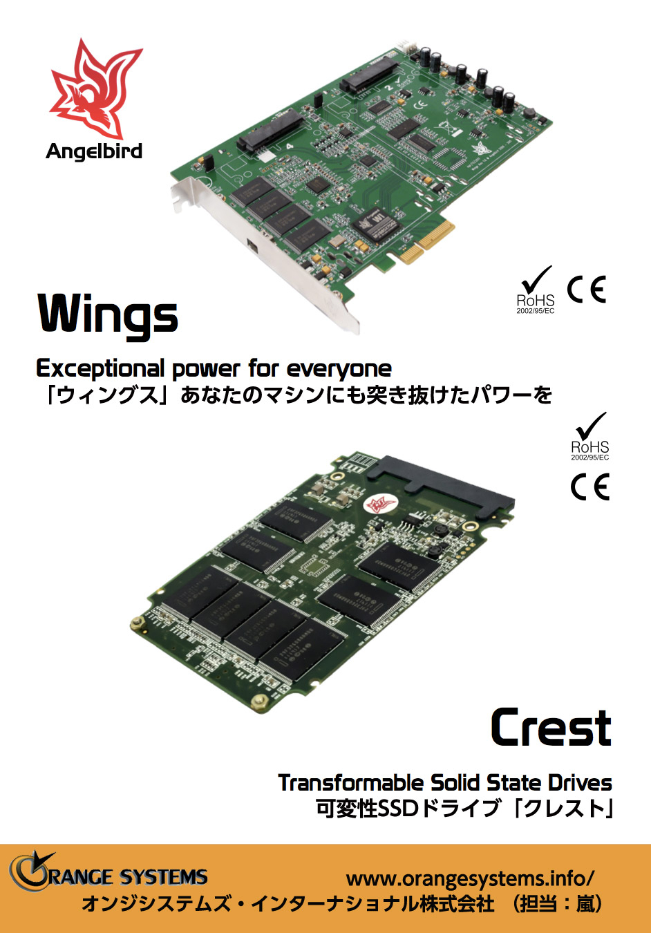 2012年1月17日 11:30 オレンジシステムズ・インターナショナル株式会社(所在地:横浜市港南区、代表:嵐 三太郎)は、オーストリアに本拠地を持つAngelbird社のPCI Express SSD RAIDカード『Wings』、ならびに可変性SSDカード『Crest』の国内販売をインターネット上で1月10日より開始いたしました。