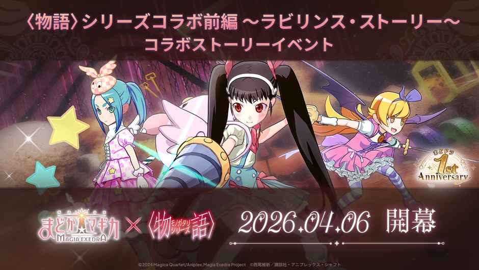2026年4月6日(月)12時より、オリジナルの物語でお贈りするコラボストーリー「〈物語〉シリーズコラボ前編 ~ラビリンス・ストーリー~」を開始いたしました。コラボストーリーイベントとなっており、「もしも〈物語〉シリーズのヒロインたちが魔法少女になったら」という「if」の姿で、〈物語〉シリーズのヒロインたちがまどドラの世界に登場する完全オリジナルシナリオでお届けします。
