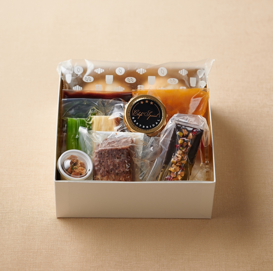 オンラインウエディングの需要の高まりとともに、このたびお客様からの要望を受けて、料理を一新。大切なお祝いの場にふさわしい上質な食材を使用した、華やかな料理へとパワーアップいたしました。新商品は3種の料理コースをご用意。前菜からデザートまで、当社スターシェフがフランス料理のスペシャリテを詰め合わせた豪華なコースを、ご自宅でご堪能いただけます。