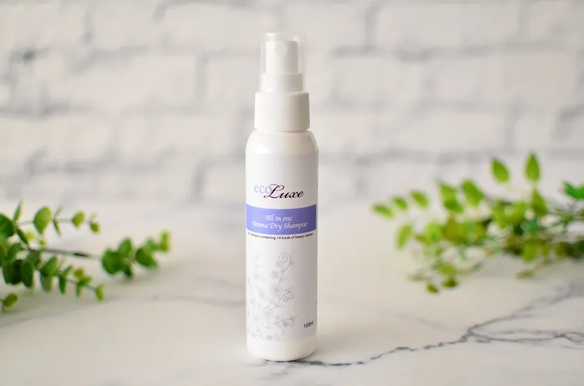 「エコリュクス オールインワン アロマ ドライシャンプー」は、100%天然由来成分を配合した水を使わずに、髪や頭皮をケアできるミストタイプのドライシャンプーです。特徴は、すべての成分が天然由来であることです。洗浄効果としてダマスクバラ花水と植物由来のアルコールを配合し、皮脂を包み込むように浮かせつつ、頭皮を乾燥させることなく、すっきりと保ちます。髪や頭皮のニオイケアには、消臭効果の高いお茶とさとうきびを配合し、ダブルの力で頭皮の嫌な臭いを軽減します。また、天然の芳香蒸留水を含んだ爽やかな心地よい香りで、頭皮の気になるニオイをカバー。ハッカとローズマリーエキスによるクールな使用感は気分をリフレッシュさせ、爽快感のある使い心地です。