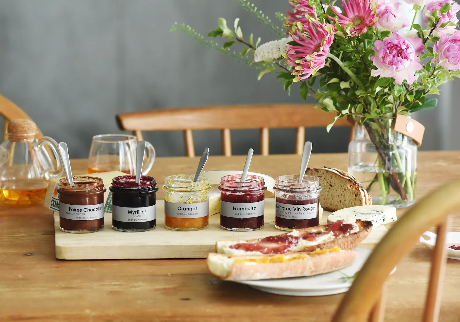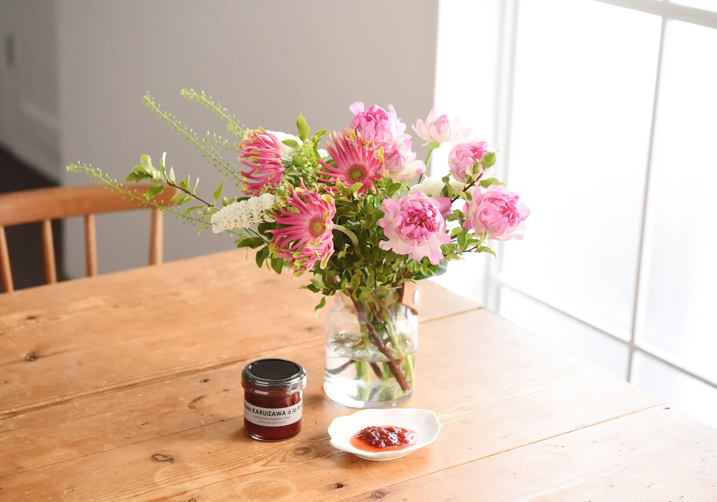 「パティスリー・サダハル・アオキ・パリ」のこだわりのコンフィチュールは、「環境の変化により行き場をなくしたフルーツを有効活用したい」というサスティナブルな想いから2020年に生まれました。日本全国の農家が手塩にかけて育てた旬のフルーツが厳選して集められ、ナッツなどと組み合わせたレシピは他では味わえない逸品です。パンやヨーグルトのほか、スイーツのソースとして、またチーズと合わせてなど、楽しみ方もさまざまです。セットでお届けする花は小さな花瓶に分けて飾っても素敵で、テーブルコーディネートとしてもお楽しみいただけます。フルーツのコンフィチュールとともに旬の花を楽しむ、素敵な1日の始まりを提案します。