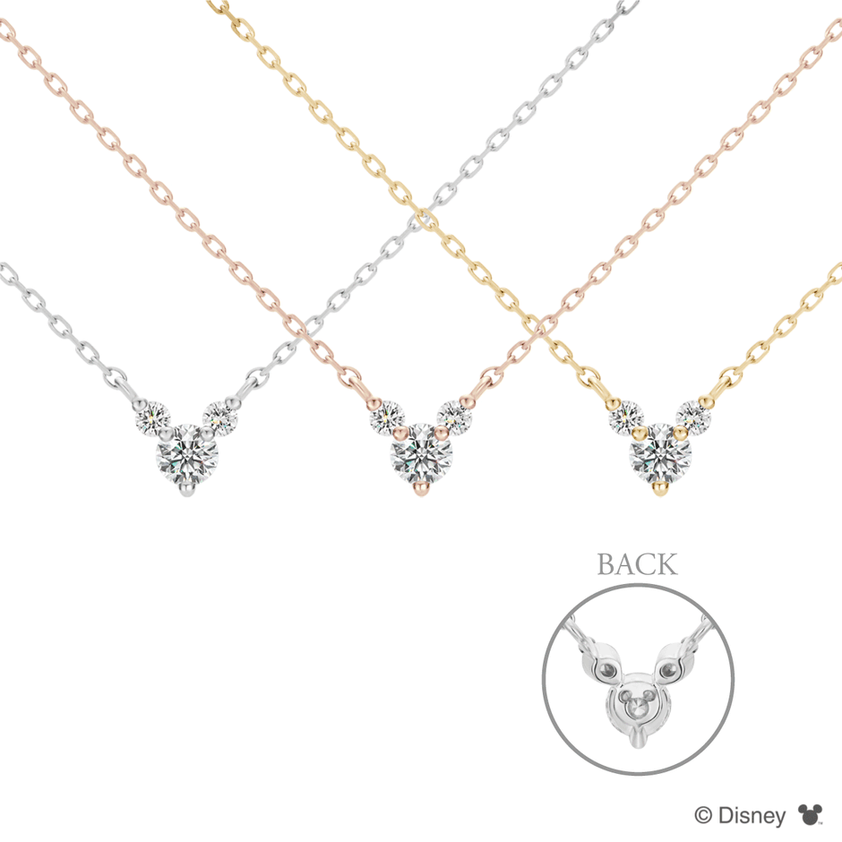 「ミッキーマウス」の人気アイコンをモチーフにしたネックレス。シンプルながらも3ピースのダイヤモンドが胸元に華やかさをプラスします。ダイヤモンドの石座(裏側)にもさりげなく「ミッキーマウス」のアイコンがほどこされています。