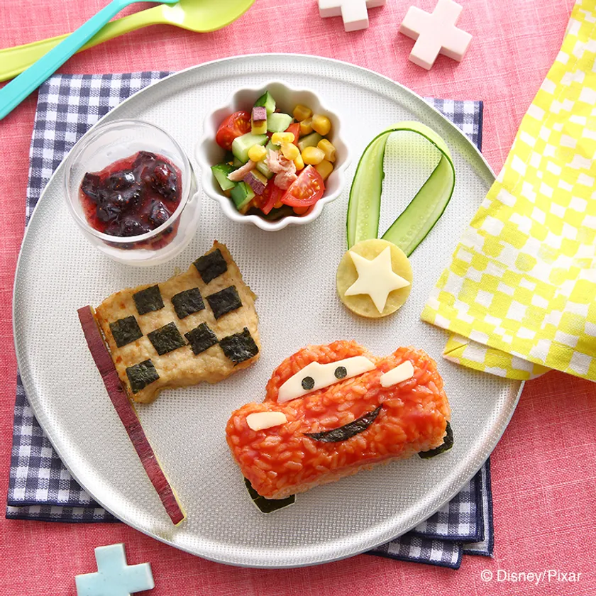 abc kidsでは素材そのものを大切にし、食べものを「いただく」ことへの感謝の気持ちをはぐくみます。生きる基本である「食べる」ことの大切さを、より豊かにより楽しく体験していただくことができます。ケチャップライスのライトニング・マックィーンをかっこよく仕上げよう!豆腐を混ぜ込んだフラッグバーグ、メダルのサラダ、デザートにブルーベリーのしゅわしゅわジュレで決まり!