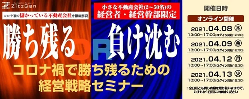 株式会社ZitzGen(本社:東京都江戸川区、代表取締役:吉本 大起、※読みがな:ジツゲン))は不動産売買事業者を対象に、コロナ禍においても業績を伸ばしている不動産会社の具体的な取り組みを解説する『不動産売買事業者向け コロナ禍経営戦略セミナー』を、2021年4月8日(木)、9日(金)、12日(月)、13日(火)にオンラインにて開催いたします。