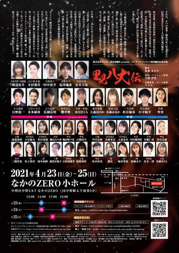 株式会社TATE(本社:東京都中野区、事業内容:殺陣・ダンスの振付会社)は、2021春公演「里見八犬伝」を4月23日~4月25日、なかのZEROにて開催致します。