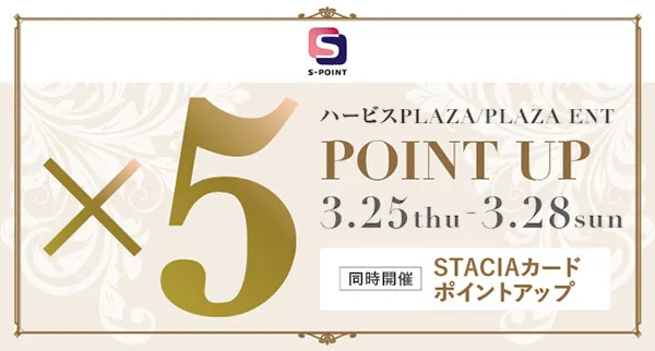 ハービスPLAZA/PLAZA ENTのSポイント加盟店でのお買い物、ご利用でポイントが5倍になるお得な4日間。通常110円(税込)ごとに1ポイントのところ期間中は5ポイント進呈!