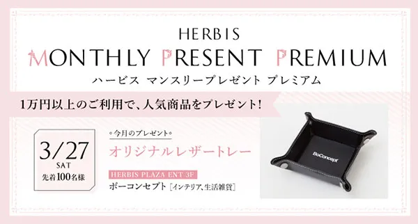 ハービスPLAZA/PLAZA ENTで当日のご利用1万円以上(税込・合算可)以上のレシートをハービスPLAZA ENT 3F「ボーコンセプト」でご呈示いただくと、人気商品『オリジナルレザートレー』をプレゼントいたします。