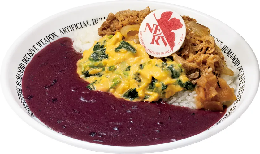 くちなしやビーツでルーを紫に色づけし、たまごの黄とほうれん草の緑で初号機カラーを表現しました。スパイスの種類や量の微調整を繰り返し、ピリッとスパイシーに仕上げています。カレーのスパイスと牛肉の旨み、とろ~りチーズが溶け出すふわふわのオムが織りなす100%のシンクロ率をお楽しみください。