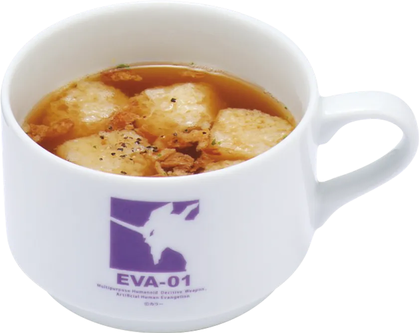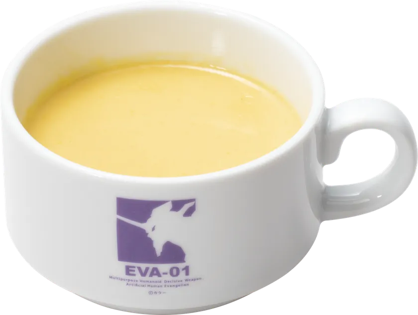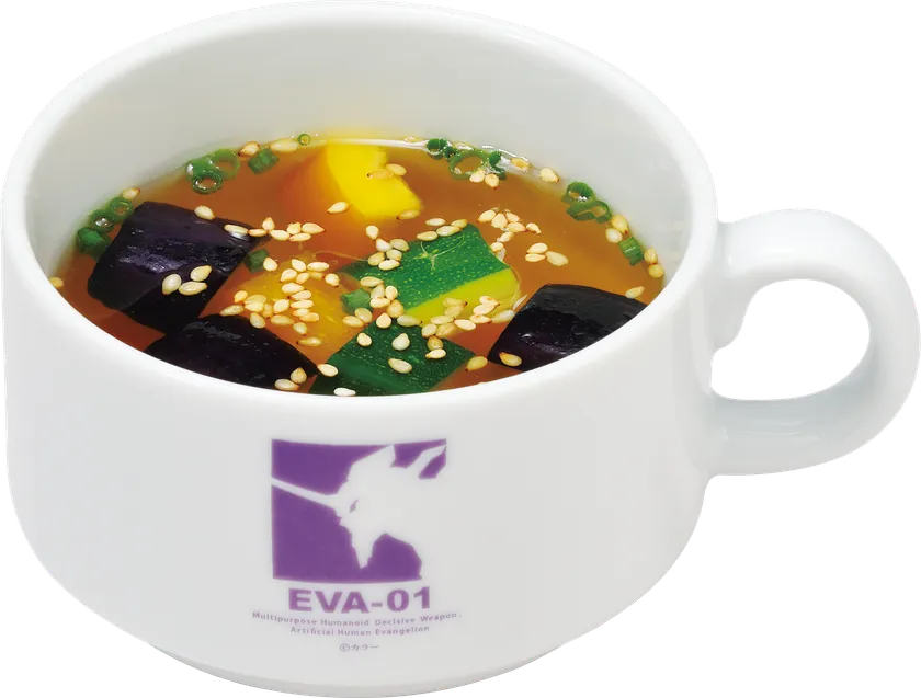 初号機カラーをイメージし、紫芋とかぼちゃで色付けした紫と黄のマヨポテ入りサラダと、クルトン入りのオニオンスープのセットです。お好みのメイン商品に合わせられるので、気軽にエヴァンゲリオンの世界をお楽しみいただけます。