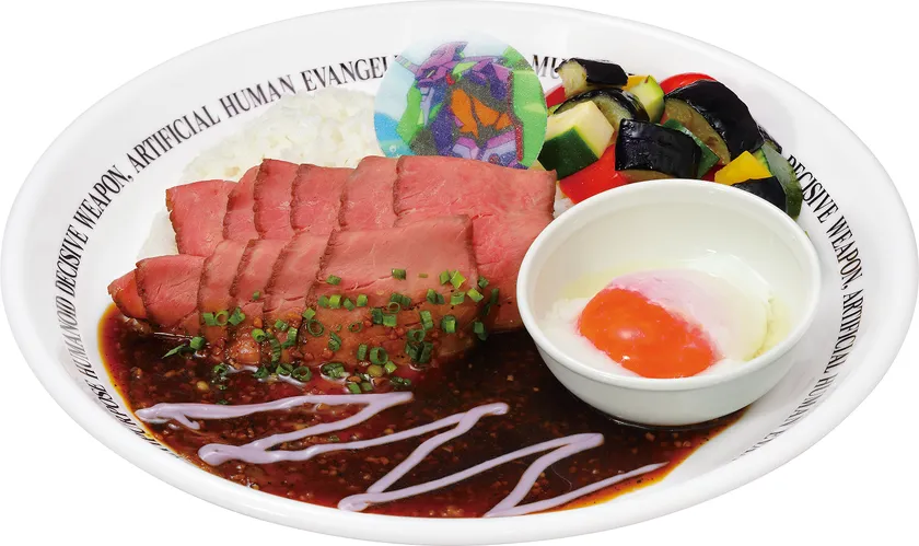 初号機カラーをイメージした紫のわさびクリームマヨソース(別添え)が味にアクセントを加える、しっとりやわらかに仕上げたローストビーフを味わえる一皿です。なすやパプリカなどのグリル野菜を添えた特製プレートでご提供します。上質な旨み溢れるローストビーフとこだわりの和風ソース、こだわり温たまとの相性抜群な味わいをお楽しみください。