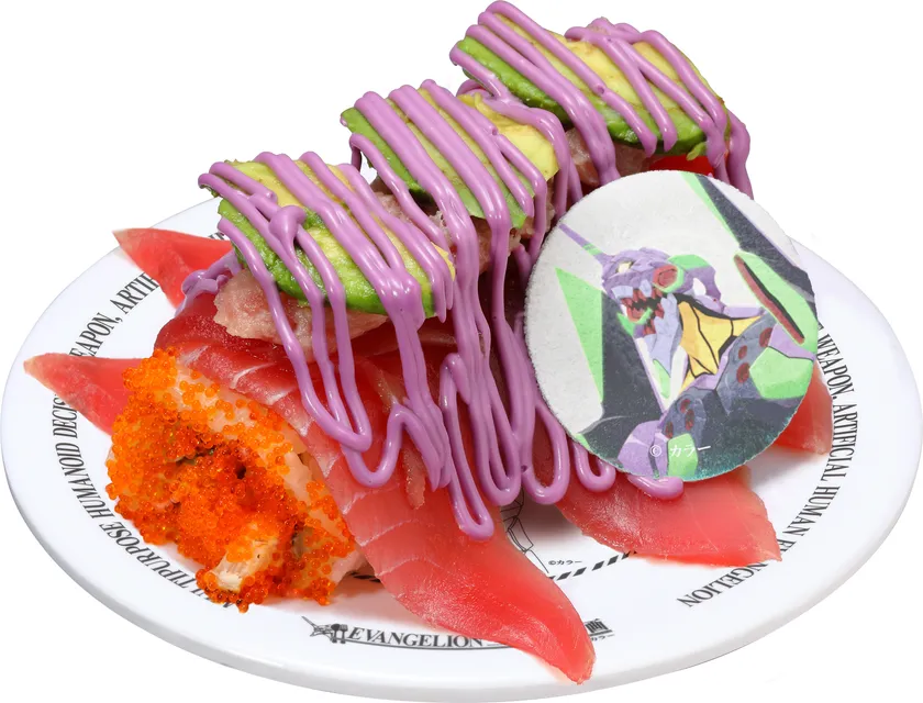 暴走する初号機を、紫のマヨソースで表現しました。カルフォルニアロールにマグロ、まぐろたたき、アボカドがのった大満足の一皿です。