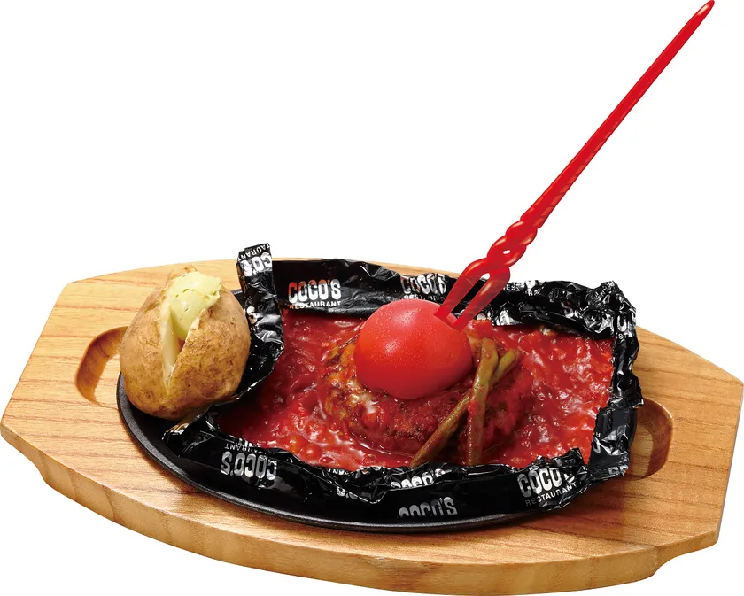 使徒を模した黒いホイルを開けると、コアに見立てた真っ赤なトマトが出現します。コアをロンギヌスの槍で突き刺し、倒された使徒の赤い液体をイメージしたピリ辛のトマトソースを絡めてお召し上がりください。ジューシーなハンバーグの中にはたっぷりのチーズが入っています。