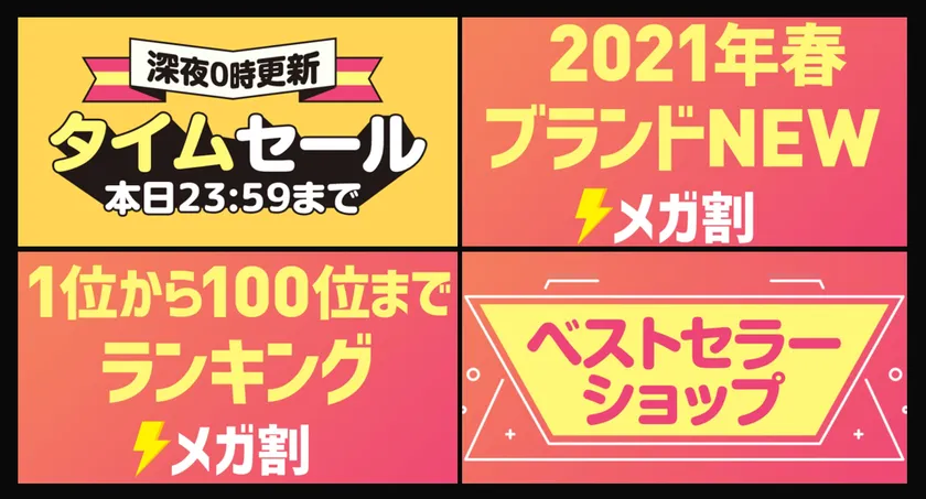 期間中は特別コーナーとして、数量限定の衝撃特価「深夜0時更新 タイムセール」や、人気ショップの商品が割引になる「ベストセラーショップ」、2021年春の新商品や新しいショップが並ぶ「ブランドNEW」、1位から100位までの売れ筋商品がリアルタイムにチェックできる「メガ割ランキング」を設置します。