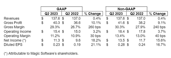 「2023年第2四半期の収益は1億3760万ドルで、2022年第2四半期から0.4%増加しました。為替レートを考慮しない基準で見ると、2022年第2四半期と比べて売上成長率は4.4%で、非GAAPの営業利益は7.1%増加しました。マジック・ソフトウェアの独自で多様なビジネスモデルは、経済的な課題の厳しい時期でも増加する利益の水準を提供し続ける強さを証明しています」とマジックのCEO、ガイ・バーンスタインは述べています。「私たちはイスラエルとアメリカでテクノロジー全般にわたる事業を継続しており、特にデジタル、データ、サイバー、クラウド、そしてコアな運用システムの分野で需要の高い領域に注力しています。クライアントにとって重要な複雑で戦略的なプロジェクトをリードし、さまざまなセクターにわたって実施しており、マクロ経済環境には慎重な姿勢を保ちつつも、成長し続けています。今後も、私たちは戦略の実行に取り組み、お客様のビジネスを管理し、効率化し、加速し、最大化するための価値を創造するソフトウェア製品とサービスの幅広いポートフォリオを構築することに専念し続けます。」