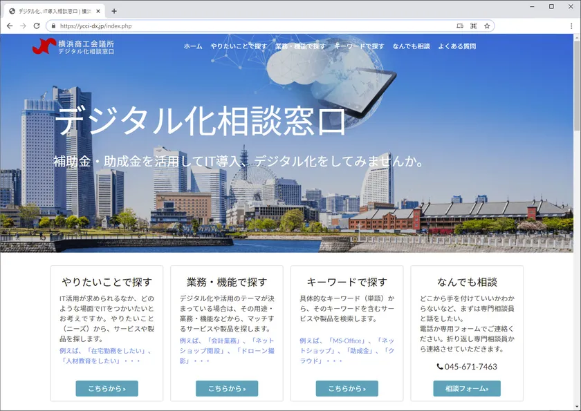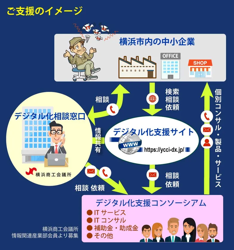 こうした背景を踏まえ、横浜商工会議所が「デジタル化相談窓口」を開設し、市内事業者のさまざまな経営課題を解決する一助として、当所専門指導員との相談のほか、コンソーシアム参加事業者(当所情報関連産業部会員)と連携しながら、経営課題の解決に最適なITツールの選定やデジタル化をサポートするとともに、助成金や補助金を活用したIT導入・デジタル化に向け取り組むこととなったものです。