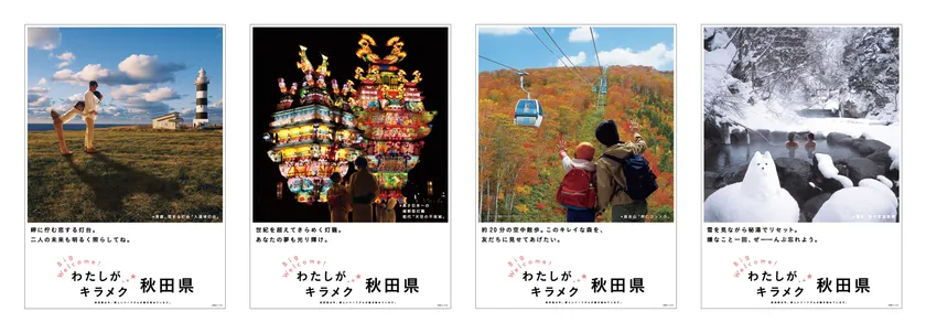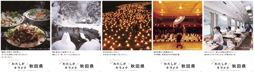 これまでの「秋田犬」をテーマに展開している県の観光プロモーション用ポスターを一新し、「新しい秋田の魅力」や「今まで見たことない秋田」をコンセプトに、新しいデザインのポスターを計20種類(春夏秋冬各5種類)作成しました。東北DC開催に合わせて、県内各市町村の他、各観光協会、道の駅等の観光施設に配布し、展開します。