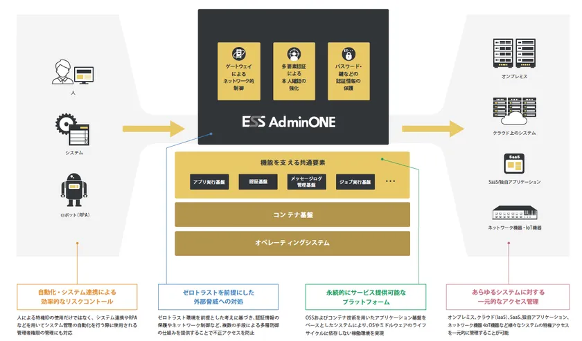 当社では、上記リスクに対処する特権ID管理ソフトウェアを従来より開発・販売してまいりましたが、DX時代のニーズに即した新たな要件に対応するため製品を刷新、「ESS AdminONE」として販売開始いたしました。