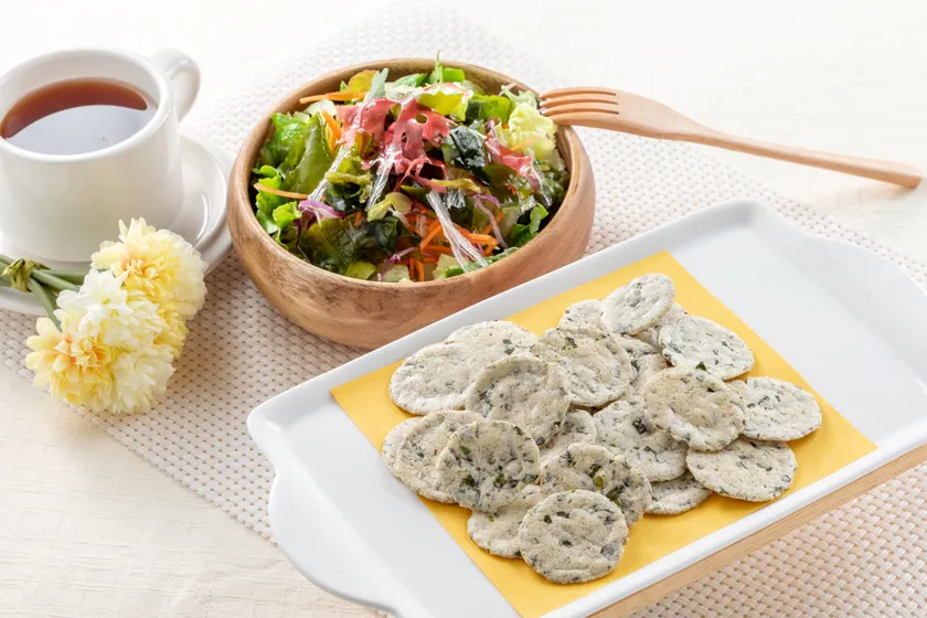 わかめ・アカモク・寒天・茎わかめ・赤つのまた・アオサの6種類の海藻としらすが入ったノンフライのおせんべいです。