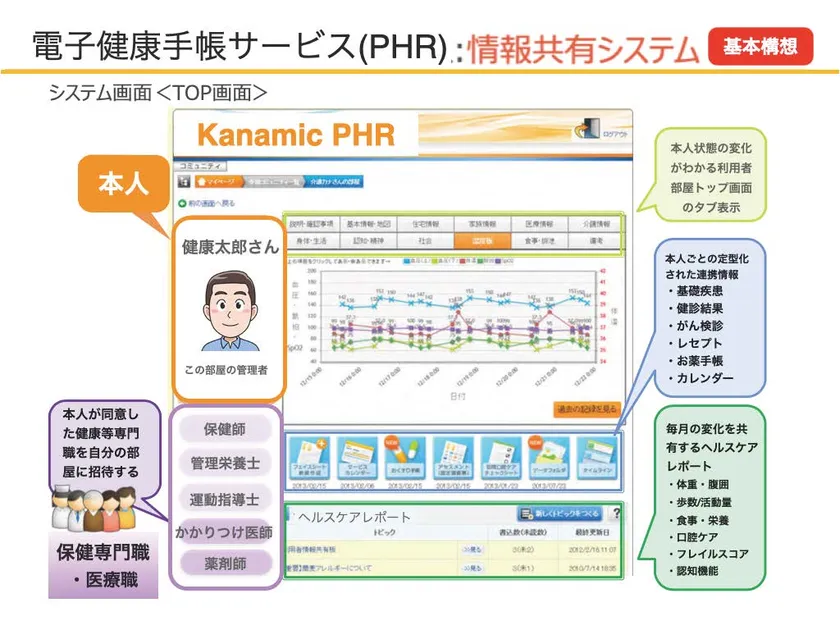 電子健康手帳は、要介護認定者向けに同社が開発したシステムと同じ構成を予定しています。未病の段階で本人に活用してもらい、バイタルデータやお薬手帳、食事・運動データ等に基づきリスクを予知しながら、本人同意の下に必要な保健専門職、医療職からアドバイスが得られる仕組みです。