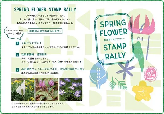 本イベントでは、当園で春に咲く代表的な山野草を、スタンプを集めながら巡っていただきます。山野草の可憐な姿を愛で、春の到来を感じていただけます。また、スタンプをすべて集めていただいたお客様には、植物園の限定ノベルティをプレゼントするほか、「山小屋カフェエーデルワイス」や次回来園時に利用できる入園割引特典を付与するなど、お得に園内を楽しんでいただけます。