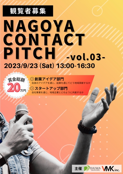パッケージ印刷・開発を行う大和グラビヤ株式会社(本社:愛知県名古屋市)は、京大スタートアップの株式会社VMK(本社:愛知県名古屋市)と共同で、東海圏の若者を対象にしたピッチコンテスト『NAGOYA CONTACT PITCH vol.3』を2023年9月23日(土)に名古屋市中区のナゴヤイノベーターズガレージで行います。