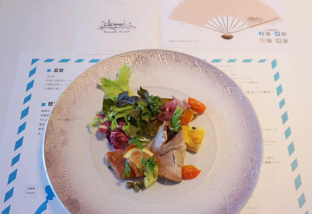 最上階デッキからは、びわ湖南部の美しい景色や比叡山・坂本の街並みをご覧いただけます。また、レストランシップとして軽食から本格的なお料理まで楽しめるだけでなく、音楽ライブや観光案内も楽しむことができるエンターテイメントクルーズ船です。