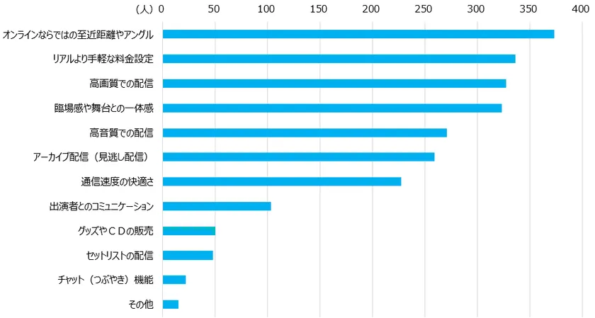 やはり料金に対する期待は高く、「リアルよりも手軽な料金設定」が2位となりました。フリー回答では、『敷居・料金が高いリアル公演よりも気軽に見られる』『オンラインであればチケットが手に入りやすい』という意見も聞かれました。オンライン配信では、リアル公演とは異なる新たな客層を掴むことにも期待できそうです。