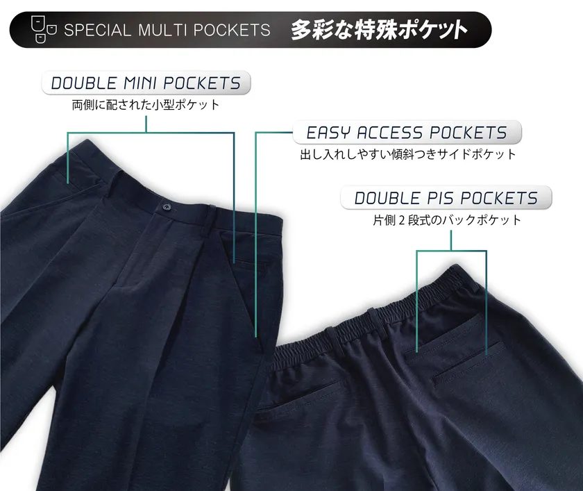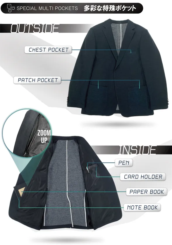 通勤自体をより“楽”にするために、ジャケット・パンツの収納性を高めるべく、多彩な特殊ポケットを付けました。ジャケットでは通常のポケット以外に、A5サイズノートも収納出来る大型ポケットが付いております。パンツも前身に通常ポケットに加え2つのミニポケット付け、後身にもダブルピスポケットを付けております。