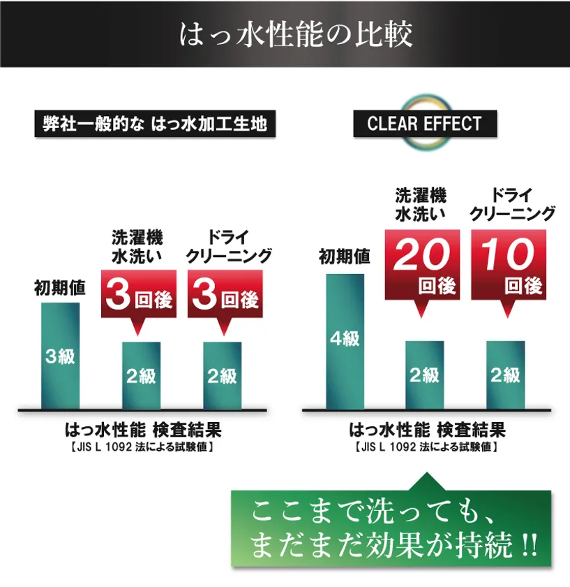 CLEAR EFFECTは他に例を見ない防汚・撥水性能を有しているだけでなく、防シワ性、ストレッチ性能も兼ね備え、前回プロジェクトの衝撃の防汚・イージーケアスーツの名前に違わない機能を有したメンズスーツです。