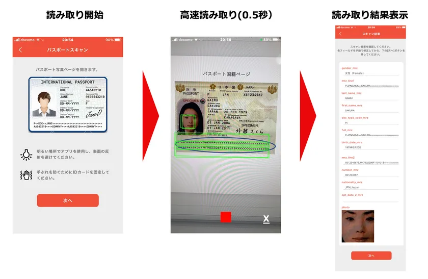 さらに、国籍ページに添付された顔写真のみをトリミングし、カメラ前にいる本人の顔と照合、パスポートとそれを提示した者とが同一人物であるかどうかも瞬時に判定できる顔認証ソフトウエアライブラリーも同時にリリースしました。(対応ID種別:パスポート、在留カード、マイナンバーカード、運転免許証)