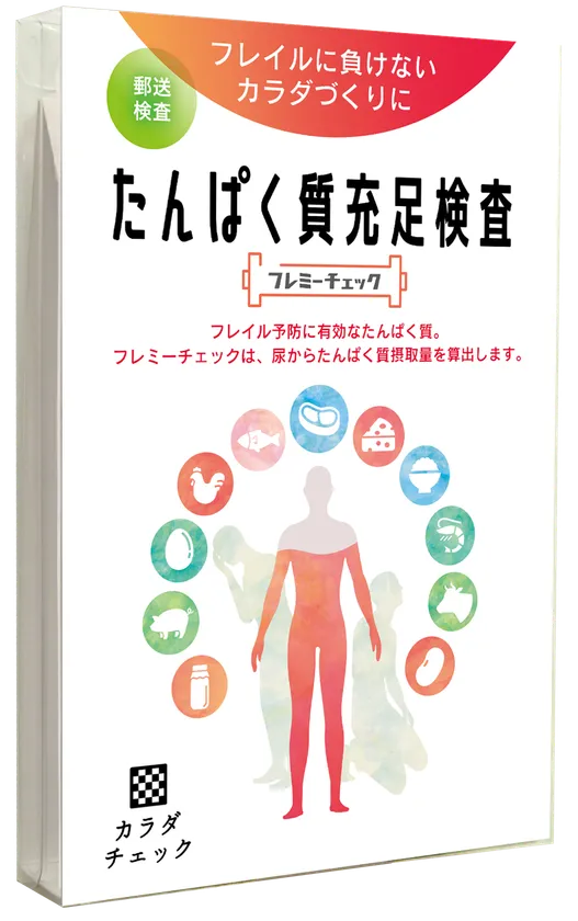 今の『たんぱく質』摂取量と不足量が数値でわかる、自身で採尿、ポスト投函で結果を受け取れるセルフケア検査です。『たんぱく質』摂取と運動のアドバイスで「フレイル予防」に役立ちます。