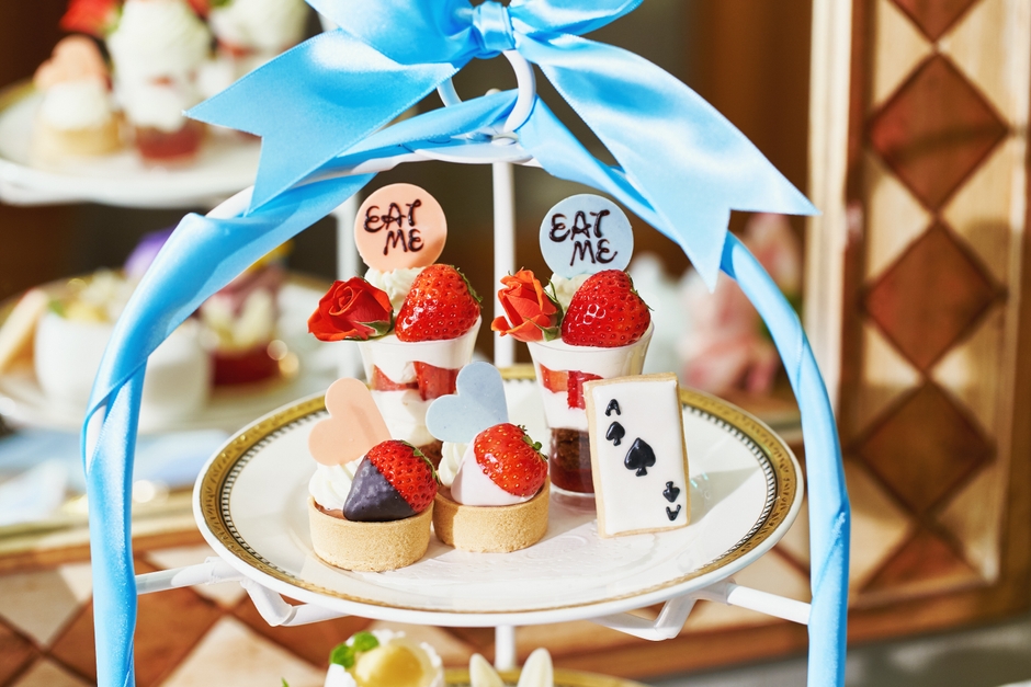 EAT ME いちごパフェや、うさ耳が愛らしいラズベリームース、チェシャ猫をイメージしたマカロン、ハートの女王をイメージしたマフィンサンドなど、アリスが白うさぎを追いかけて迷い込んだ“不思議の国”の生き物をモチーフにしたキュートなスイーツや軽食を、紅茶とともにご堪能ください。