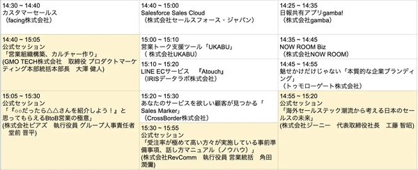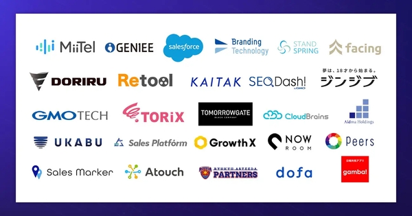 株式会社RevComm、ギグセールス株式会社、株式会社アイドマ・ホールディングス、株式会社セールスフォース・ジャパン、IRISデータラボ株式会社、CrossBorder株式会社、GMO TECH株式会社、facing株式会社、琉球アスティーダスポーツクラブ株式会社、株式会社UKABU、株式会社gamba、株式会社Retool、株式会社イメジン、ブランディングテクノロジー株式会社、株式会社ドゥーファ、トゥモローゲート株式会社、株式会社ジンジブ