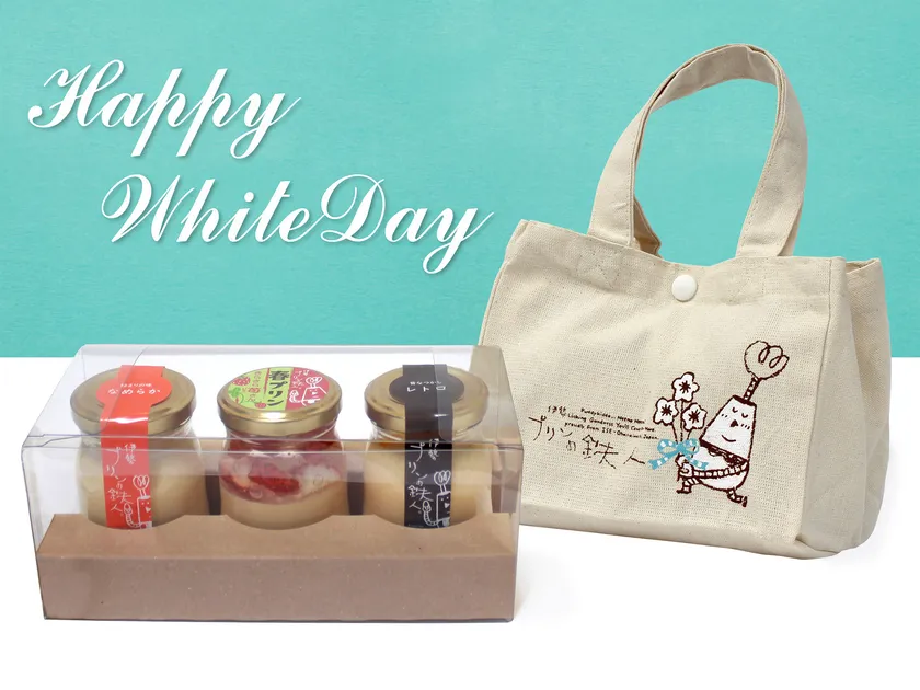 また3月14日までの期間に店頭で「なめらかプリン」、「レトロプリン」、「春プリン きらきら苺さん」の3個セットをご購入いただくと、期間限定でホワイトデーバージョンの「伊勢プリンの鉄人」オリジナルトートバッグをプレゼントさせていただきます。