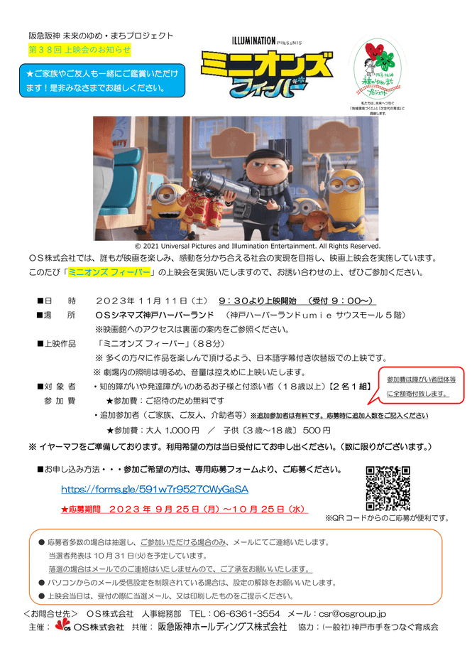 シネマコンプレックス「OSシネマズ」を経営するオーエス株式会社(本社:大阪市北区、取締役社長:髙橋秀一郎)は、阪急阪神ホールディングスグループの社会貢献活動「阪急阪神 未来のゆめ・まちプロジェクト」の一環として、知的障がいや発達障がいを持つお子様とそのご家族を対象とした映画上映会を、11月11日(土)にOSシネマズ神戸ハーバーランドで実施いたします。